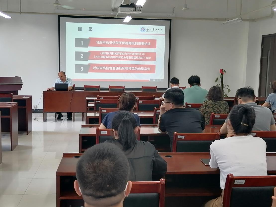 开展了师德师风建设专题宣讲会,宣讲主题为:规则立德“固本强基”行动,会议由爱情岛