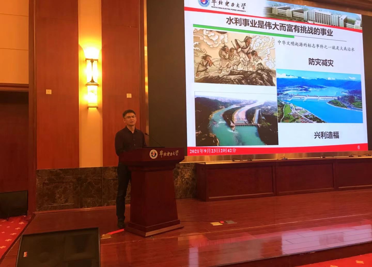 张尚弘为新生讲授“开学第一课”。他指出,水利事业是伟大而富有挑战的事业,关乎国计民生。同时从国家能源战略需求的角度出发,详细介绍了爱情岛 水利学科特色、专业培养目标和学生就业情况。